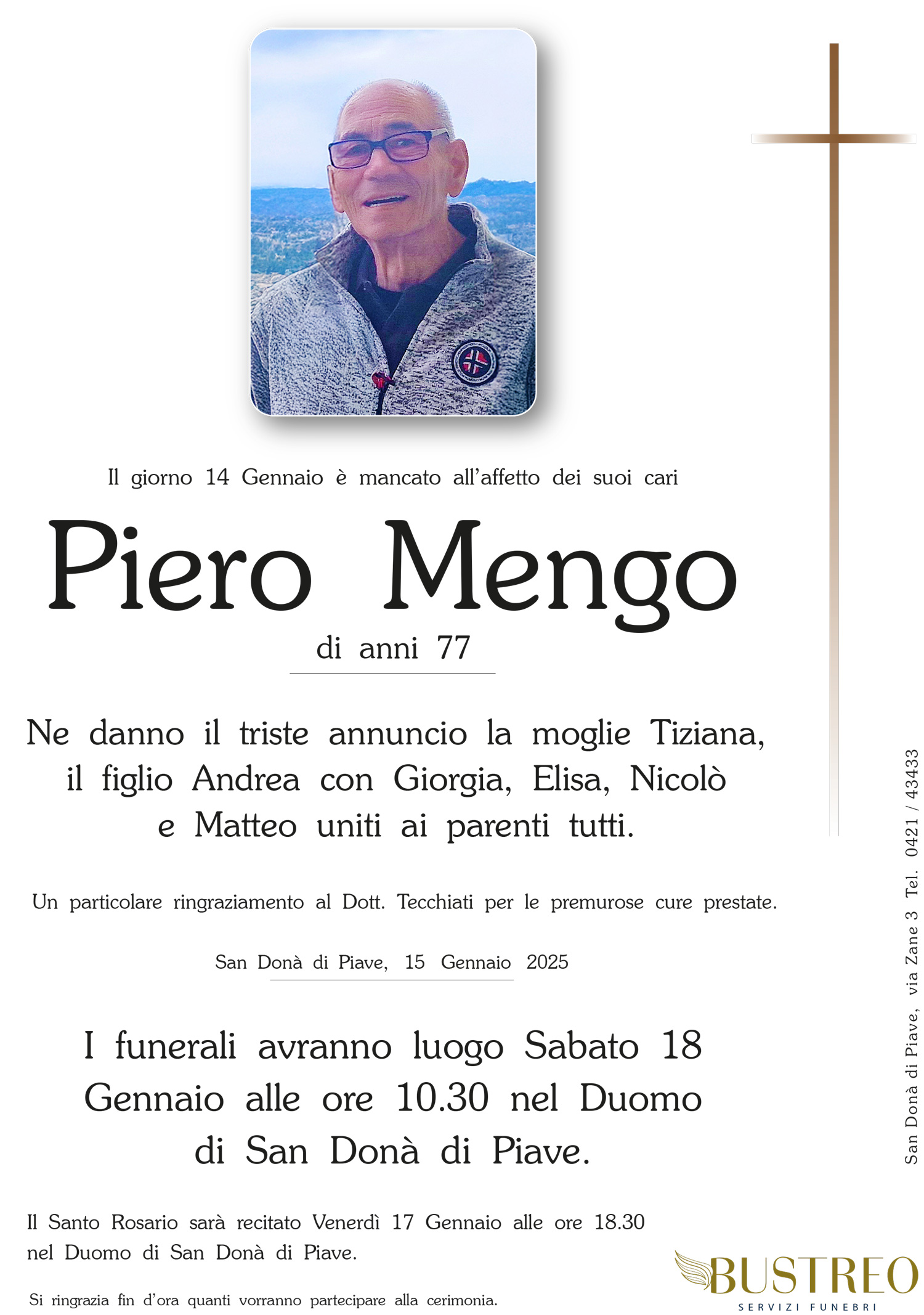 Possa il vostro dolore trovare conforto nel sostegno del Signore e nella certezza che vostro padre è sempre vicino a voi. Il calore della nostra amicizia riscaldi i vostri cuori.