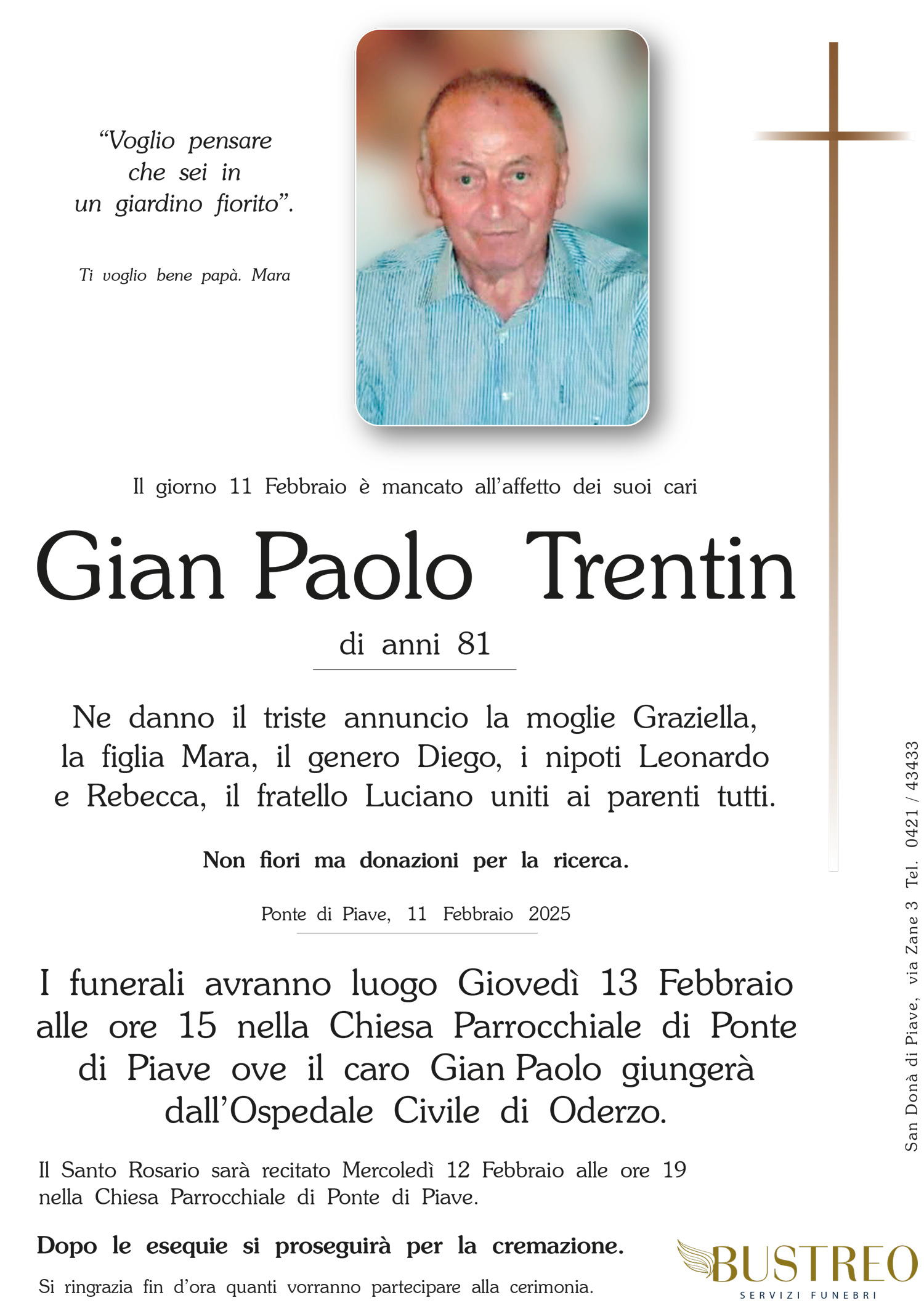 Possa il vostro dolore trovare conforto nel sostegno del Signore e nella certezza che vostro padre è sempre vicino a voi. Il calore della nostra amicizia riscaldi i vostri cuori.