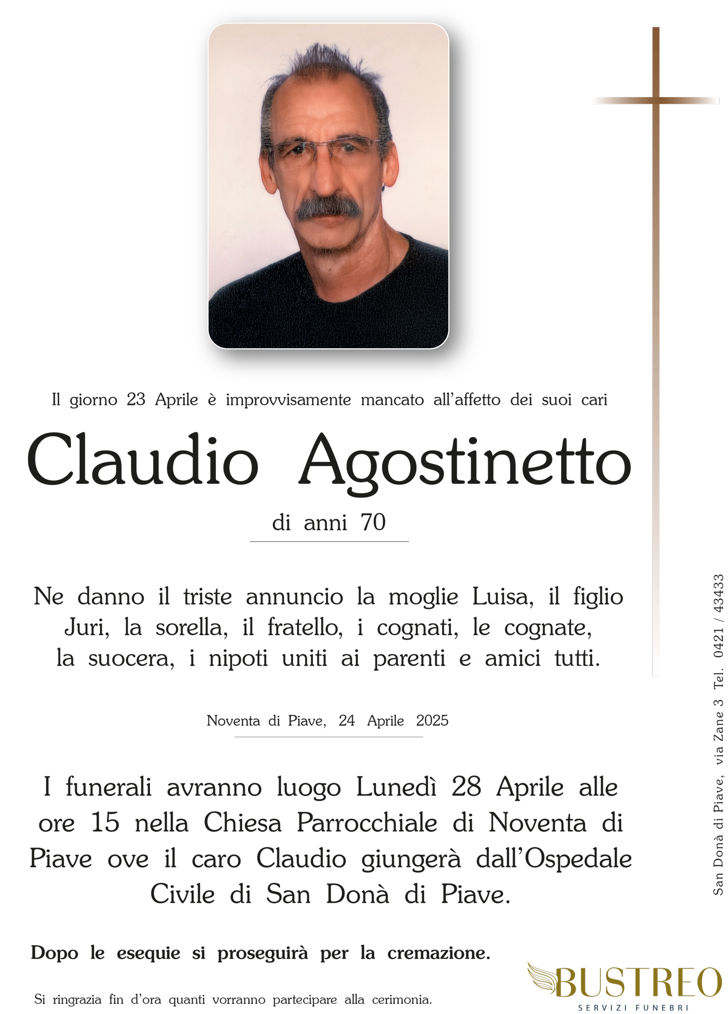 Possa il vostro dolore trovare conforto nel sostegno del Signore e nella certezza che vostro padre è sempre vicino a voi. Il calore della nostra amicizia riscaldi i vostri cuori.